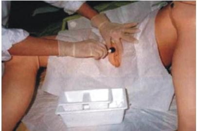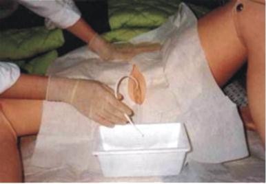 十二、手持已润滑之导尿管,导尿管的末端置于导尿盆内,请病人口张开做深呼吸,再轻轻的将导尿管插入病人的尿道中;女病人插入长度约3-5公分,男病人插入长度约15-20公分,如图十三、十四。