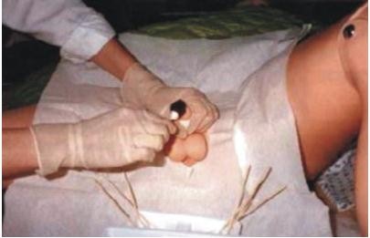 (二)男病人消毒方式:以一手垫纱布握住病人阴茎举高并固定,另一手取三枝无菌冲洗棉枝沾湿优碘,消毒顺序如下:优碘棉枝自尿道口由内向外环形擦拭至阴茎(重复三次),每次使用须更换新的一支优碘棉枝,如图十二。