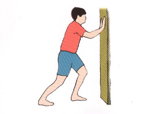 跟腱伸展运动(图2):面对墙壁,双手手掌贴着墙壁,逐渐弯曲手肘,使上半身靠近墙壁,双脚脚跟不可离地,后脚膝盖微曲,身体保持平直向前倾斜,当感到脚踝后侧肌腱紧绷即可,维持10至30秒,每一脚重复5至10次。