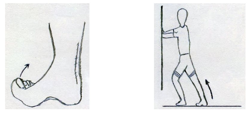 (图一)足底筋膜拉筋运动:用手将脚趾往上扳起 (图二)腓肠肌拉筋运动