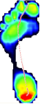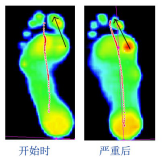 横弓塌陷:横弓塌陷可引起足前掌中部(第2、3或4跖趾关节)受力过大,一般表现为脚掌中间有厚厚的茧,严重者会导致皮下出血,走路时如针刺一样疼痛。动态足底压力图像表现为重心沿横弓走行;曲线表现为蹬伸阶段出现明显峰值。