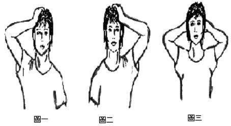 (三) 双手交迭于头后,当头向后顶的同时,双手向前施力,保持头在正中不使头后移,如图三。