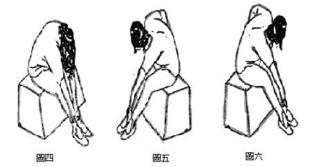 (一) 头及身体下压前弯,双手顺着双腿缓缓滑下,尽量去触脚,以伸展整个背部,维持5-10秒后放松,回到坐姿,如图四。