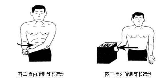 内旋:患肢放腰侧,用健侧顶住患侧手臂用力向内对抗健肢,如图二。