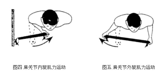 内旋:利用橡皮带的弹性,橡皮带一端固定于墙壁上,患侧将另一端用力拉向身体中线,如图四。