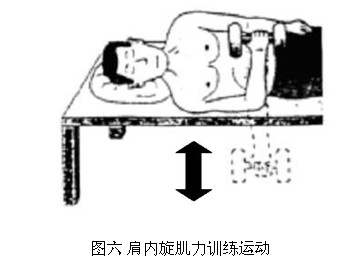 内旋:侧躺时患侧在下,上臂平贴于床面,将装水的宝特瓶或哑铃举起至靠近身体,如图六。