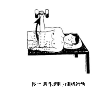 外旋:侧躺时患侧在上,上臂平贴于身体,将装水的宝特瓶或哑铃举起至与身体呈垂直,如图七。