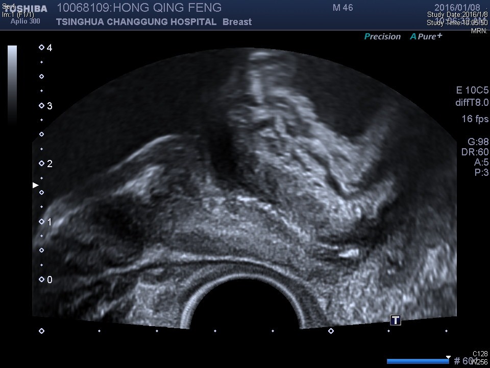 经过4周的康复训练,患者肢体功能明显提高,基本实现康复目标,立位平衡1级,助行器辅助下可独立完成坐站转移,短距离步行,肌肉萎缩减轻。但患者排尿功能无明显改善,自主排尿功能无恢复,手法不能诱发排尿,仍需间歇导尿每日4次,考虑患者有尿道括约肌痉挛,予口服盐酸特拉唑嗪,症状无明显改善,为进一步明确尿道病情变情况,予经直肠超声检查:可清晰显示尿道外括约肌,并提示尿道外括约肌有痉挛,遂于超声引导下尿道外括约肌肉毒毒素注射术,术后第二日,患者手法诱发反射性排尿50ml,术后第六日,患者可在20分钟左右主动排尿约400ml,但由于患残余尿仍在200ml左右,间歇导尿次数减至每日2次,患者拟近期回当地专科医院继续治疗。