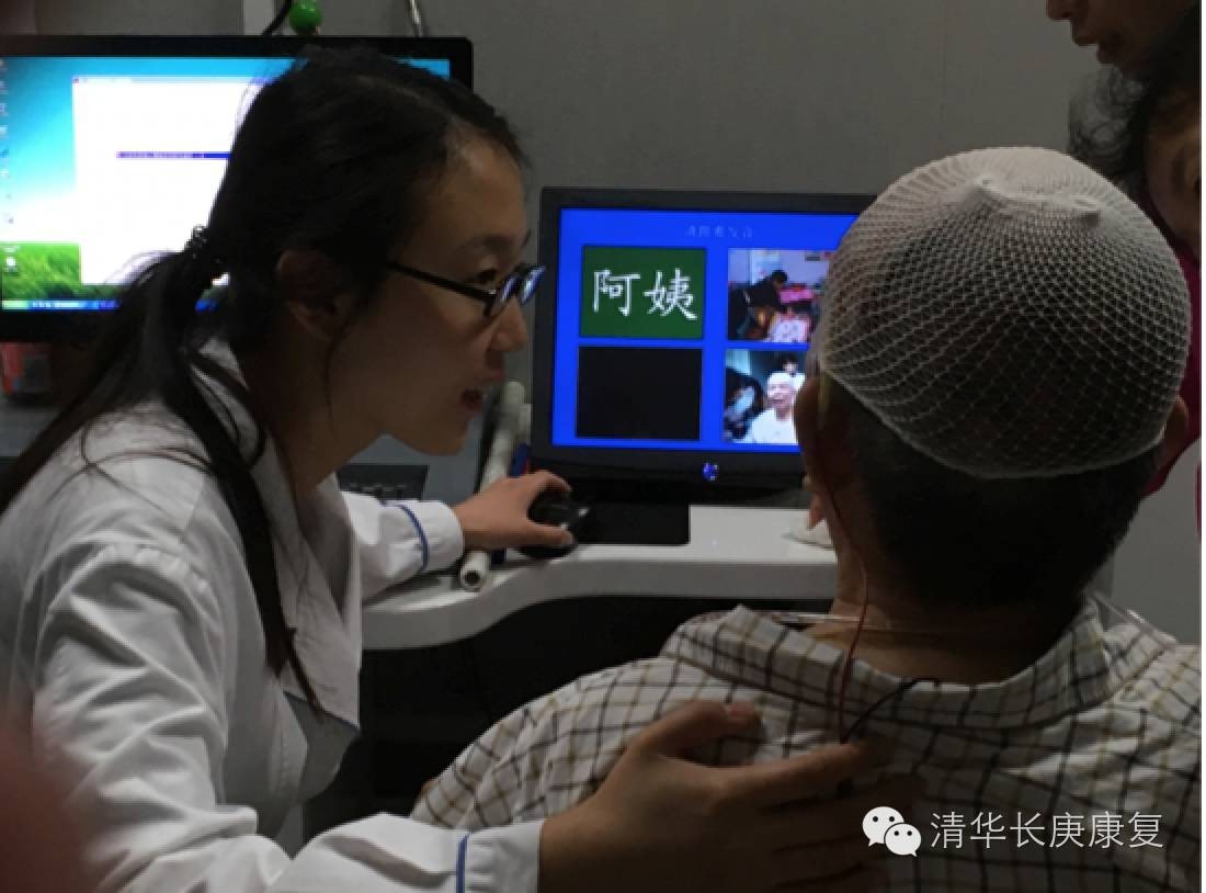 在一次常规的训练中,屠老师继续努力地引导李叔发声,最近两天李叔能偶尔的发出一个“啊”。屠老师说:“大叔,看着屏幕,跟着读一遍”,此时训练软件中发出“阿姨”的读音,李叔出乎意料的用颤抖的声音说了句“阿-姨”。