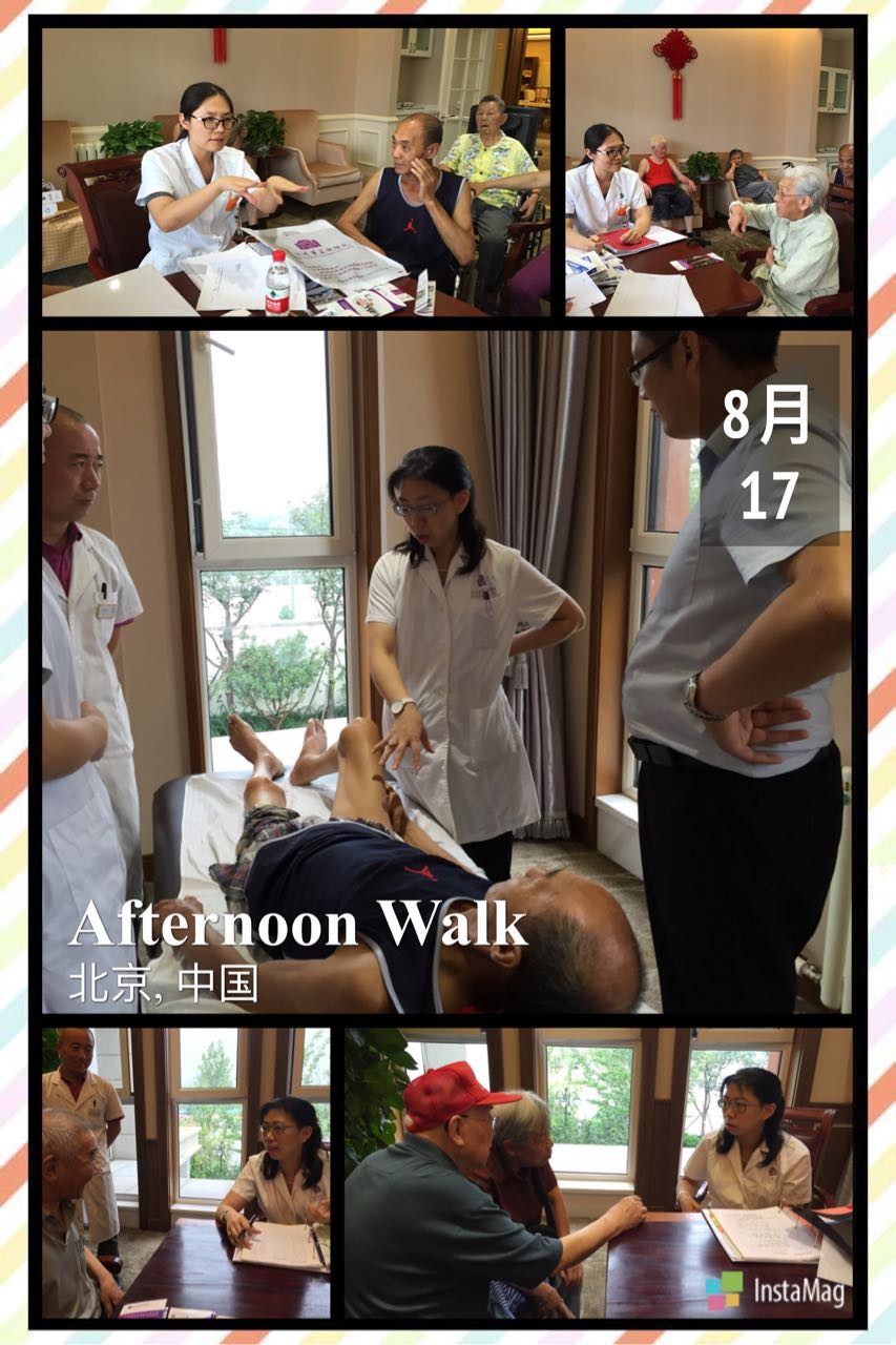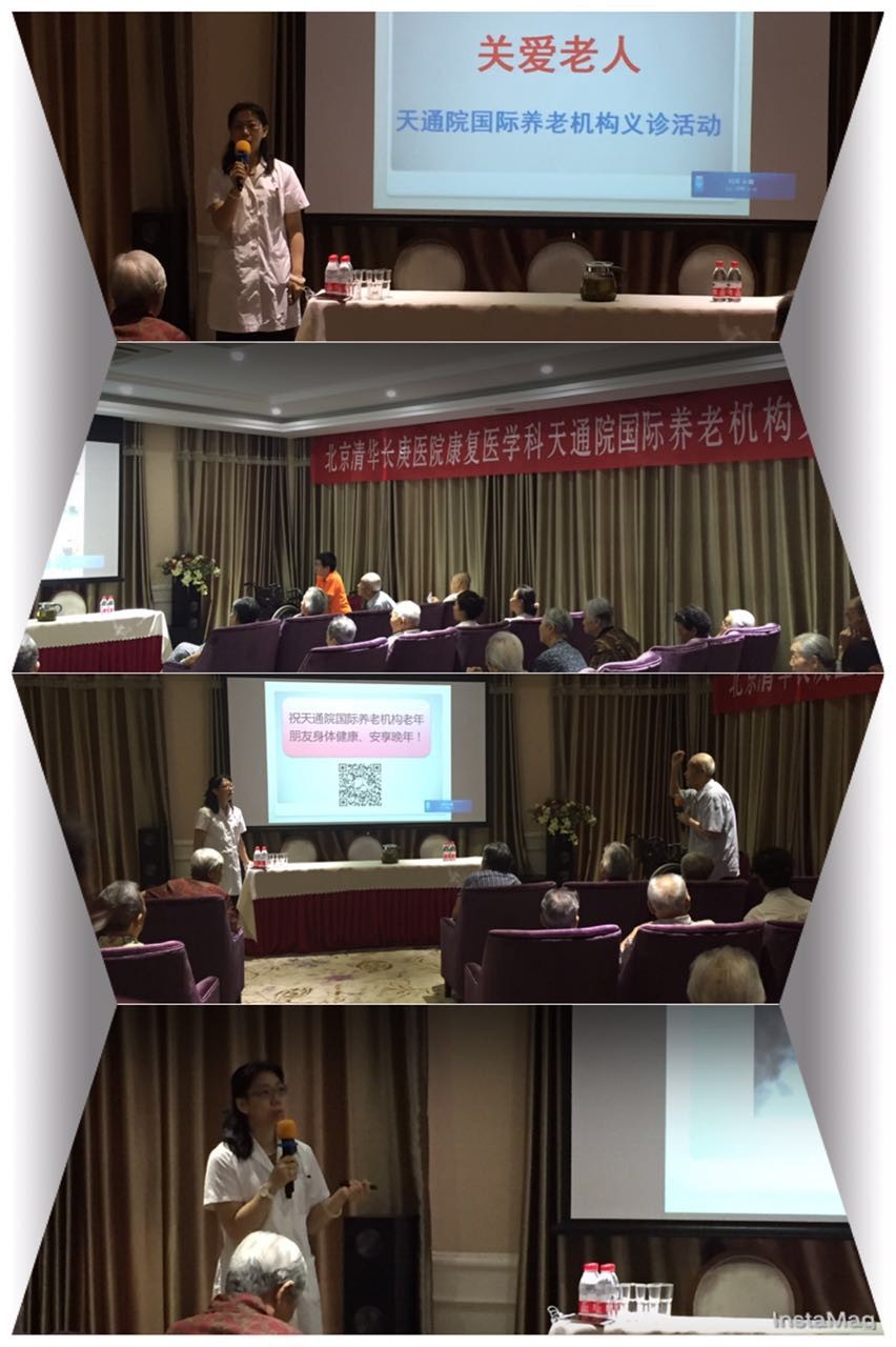 2016年8月17日,在潘钰主任的带领下北京清华长庚医院康复医学科的医务人员前往天通苑国际养老机构举办了义诊活动。在养老院内工作人员的协助下,义诊活动在下午2点准时开始,首先由潘钰主任进行了以“颈肩腰腿疼痛康复治疗策略”为主题的健康讲座,潘主任分别就慢性疼痛疾病的危害,原理,预防,治疗四个方面做出了深入浅出的讲解,获得在座老人的广泛认同。讲座结束后,潘主任还就老人们的提问做出了详细的解答。
