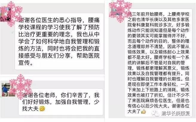 至此,北京清华长庚医院康复医学科已经成功举办过两届腰痛学校,学员们通过腰痛学校的学习受益良多。目前,腰痛学校已经成为北京清华长庚医院针对腰痛患者进行长期管理的特色品牌,我们不仅对腰痛人群进行治疗,健康宣教和日常活动指导,未来我们还要为广大患者消除腰痛做的更多。