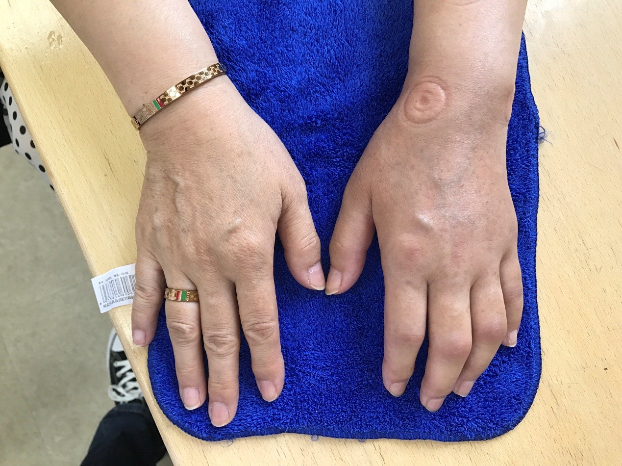 左手皮肤水肿至腕上4cm,双侧腕部周径相差1.3cm |