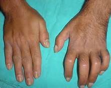 活动度减少,腕关节桡偏10°尺偏8°,背伸10°,掌屈15°,MP,DIP,PIP均受限,中指,无名指PIP尤为明显。大鱼际,小鱼际均有肉眼可见的萎缩,虎口间距变窄 |