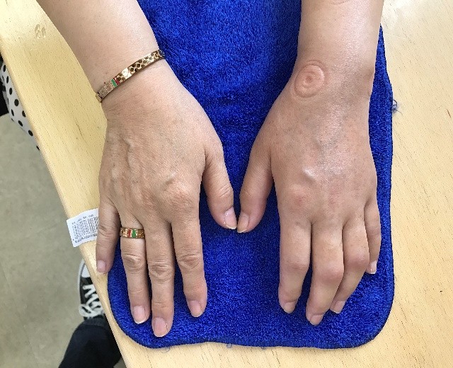 张阿姨,60岁,骑小黄车过程中前胎爆裂导致骑行中突然向前方跌倒,腕部着地,导致左侧桡骨collesⅠ型骨折,复位后石膏外固定两月余后,骨骼愈合良好,但无诱因出现左手轻微触碰即剧烈疼痛,向腕部及上臂弥漫性放散,呈扳机样灼烧样疼痛,无法持物。睡眠及晨起加重,活动后减轻。皮肤肿胀、异常发汗且颜色异常,关节受限明显,来我康复科寻求康复治疗。