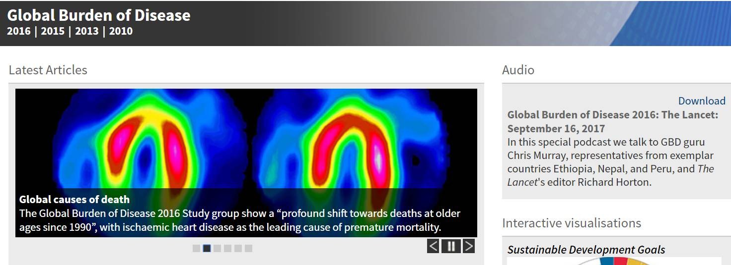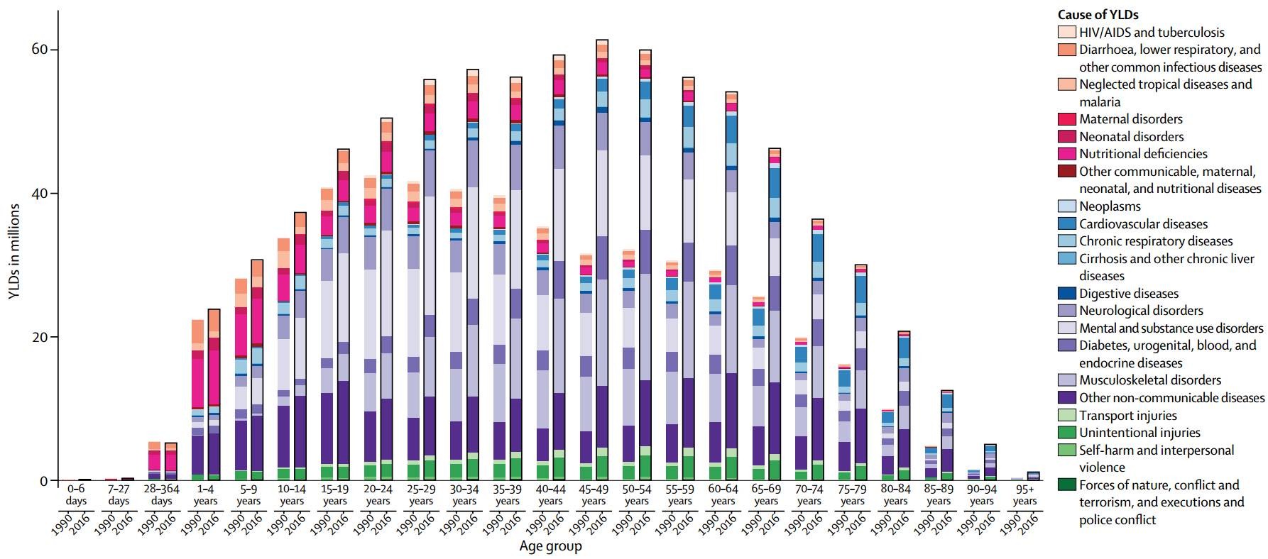 最新一期的《柳叶刀》杂志新鲜出炉,公布了2016全球疾病负担研究( Global Burden of Disease Study 2016, GBD)的很多数据。该专题有六篇文章,主要讨论了近年来人类健康问题,包括全球死亡率,死因,疾病的患病率及发病率,不同疾病折损寿命年数,生活中健康危险因素等等。其中最引人关注要数不同疾病的折损年数,也就是伤残损失寿命年(YLDs)。