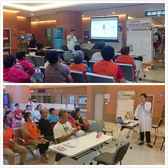 图1 徐泉主治医师进行健康讲座,谢树物理治疗师进行康复训练指导