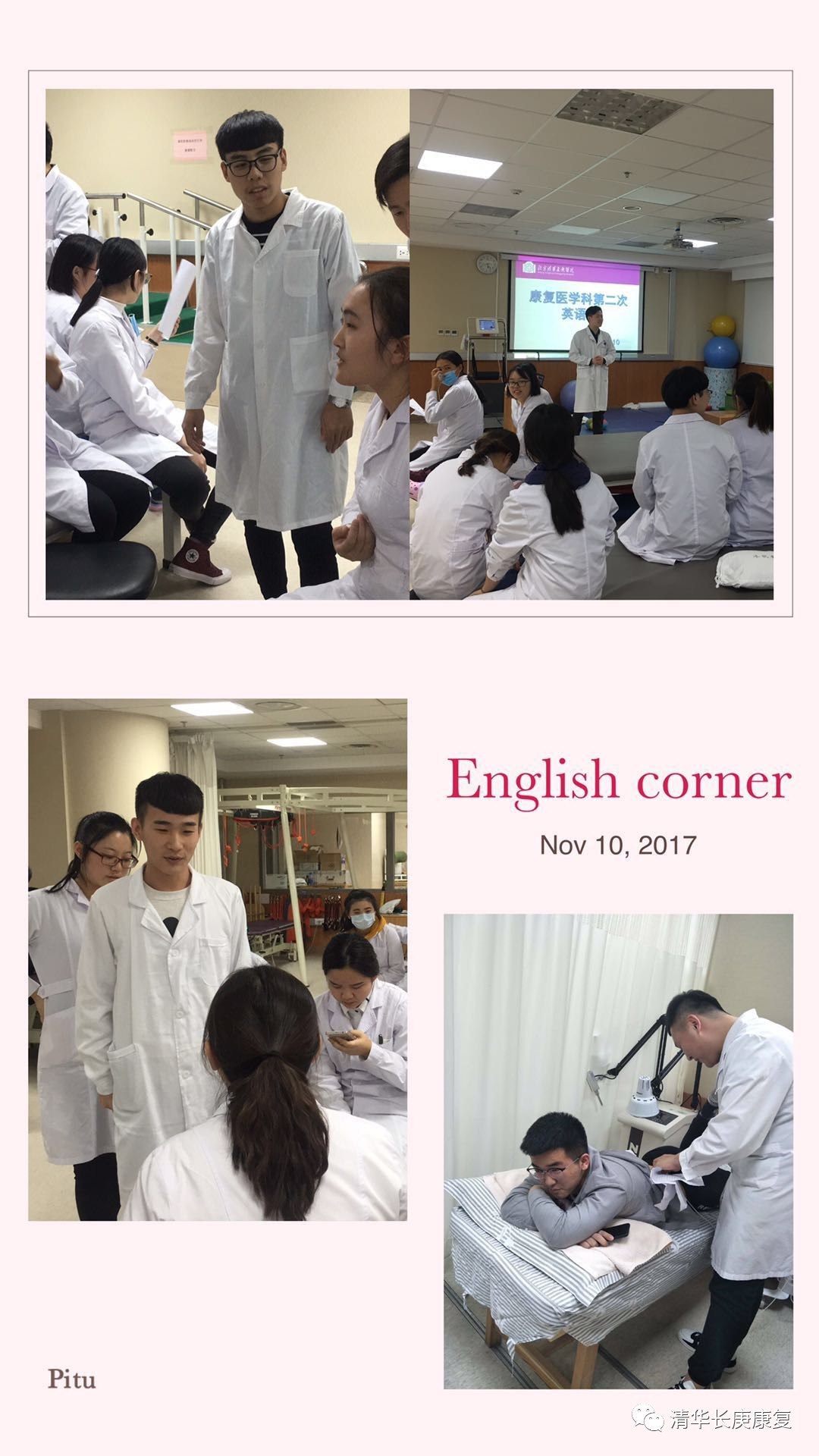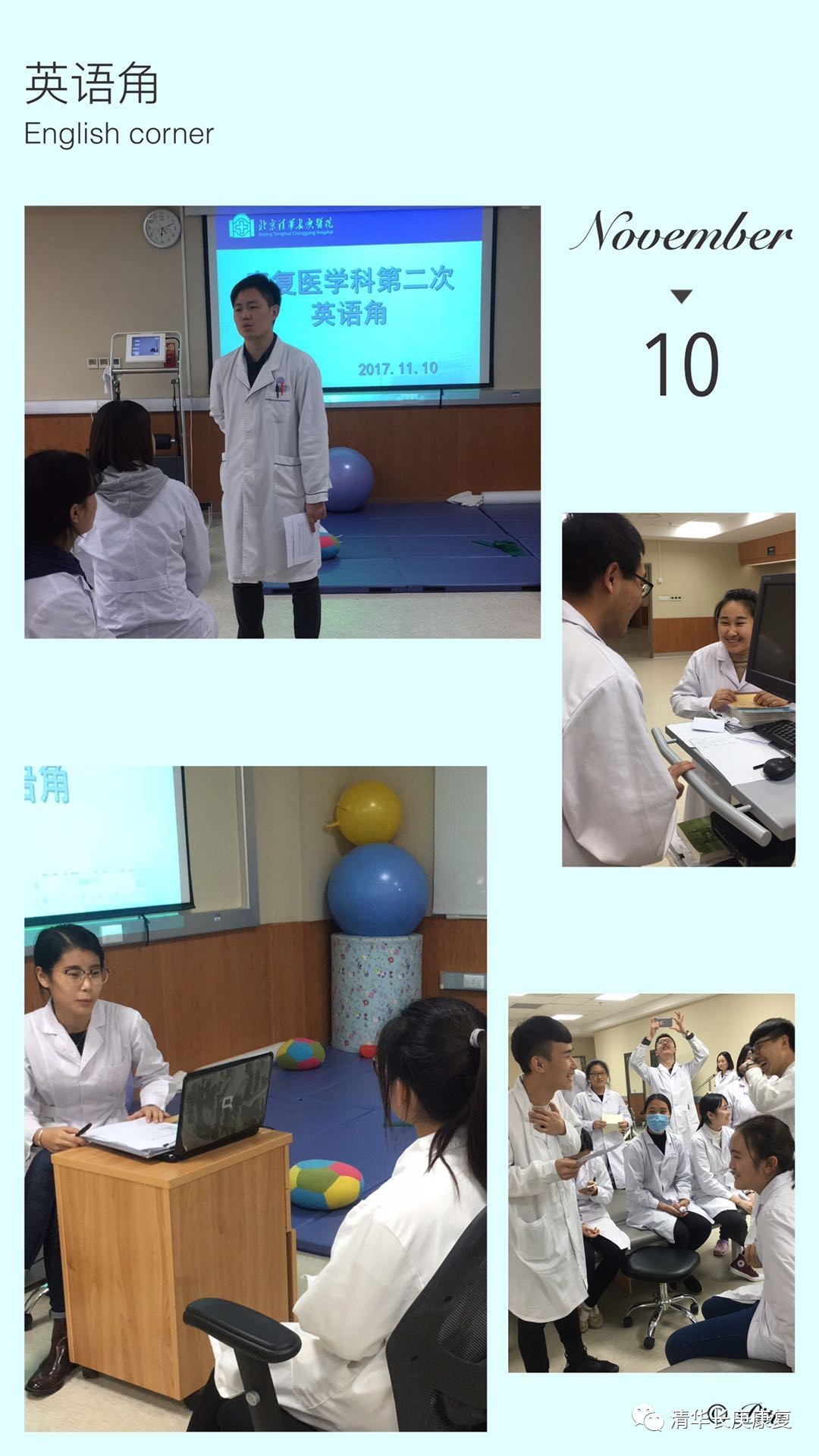 通过此次别有特色、欢乐互动的英语角活动,使我们不仅潜移默化的掌握了英语会话的技巧,也从中体会到了学习英语的乐趣,当然也意识到了沟通的魅力。来到北京清华长庚医院康复医学科学习5个多月了,每天工作紧张而忙碌着。老师们利用中午和下班时间给我们授课,理论知识和实践经验都有很大收获。英语角的活动更是让我们每一个学生主动参与到学习中,让我们受益匪浅,更加激发了同学们学习的热情,这样的实习机会和学习气氛我会非常珍惜的。我已深深的喜欢上了这个积极向上的康复医学科。