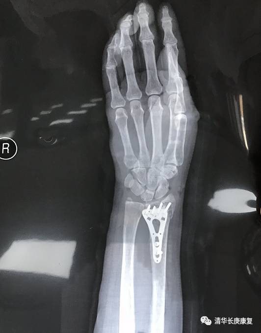 崔阿姨受伤类型属于Ⅰ类弯曲性colles骨折,骨折远端向背侧移位。因右桡骨骨折内固定手术后腕关节活动受限伴疼痛肿胀两月余,严重影响日常生活来康复科就诊。右侧腕关节X光片显示右桡尺骨骨折内固定手术后,骨折愈合良好。这与我们之前所推荐的治疗方式基本一致,崔阿姨接受了良好的外科治疗并且骨骼恢复良好,但早期并未进行正规康复训练,那么功能的延迟回复与肿胀疼痛就需要康复的介入进行处理。