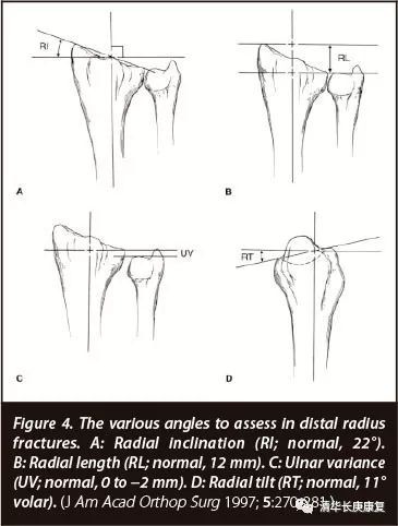 图示内容:桡骨远端掌倾角(RI:正常22°),桡骨高度(RL:正常12mm),尺骨差异(UV:正常0-2mm),腹侧倾角(RT:正常11°)