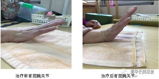 关节活动度受限:掌屈10°,背伸20°,尺偏10°,桡偏0°,旋后60°,各指间关节屈曲不充分,长期的制动致肩关节活动明显受限。
