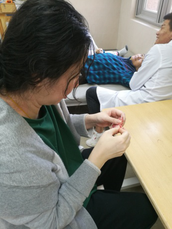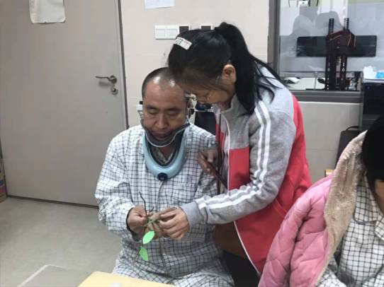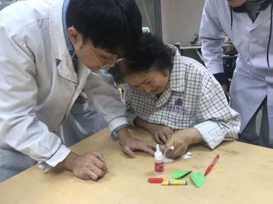 图为淋巴水肿的美女阿姨利用治疗师特别准备的粗针和手功能协调障碍的大叔进行精细操作