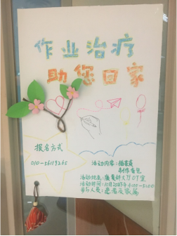 其实作业治疗甚至康复治疗,不仅在患者中没有被广泛地了解,在医院中也不被同行所熟知,为了促进多学科合作,造福更多的患者,我们在活动结束后将作业治疗简介的海报、本次小组过程的照片和成果在医院回廊中进行展示。