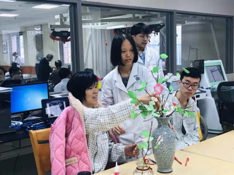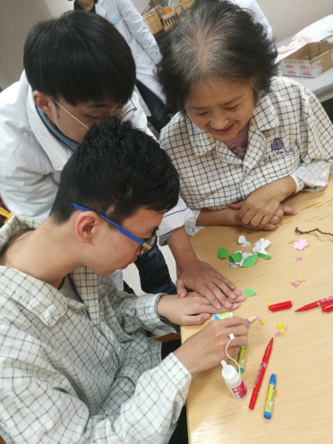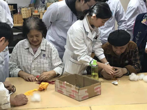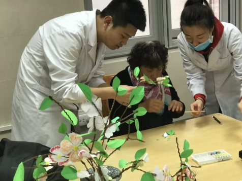 图为实习同学辅助患者完成茱萸花制作