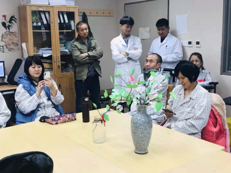 图为患者开心地将制作完成的茱萸花插入花瓶,纷纷拿出手机拍照留念