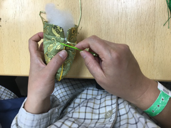 图为在完成了茱萸花制作,努力尝试自己完成香包制作的阿姨