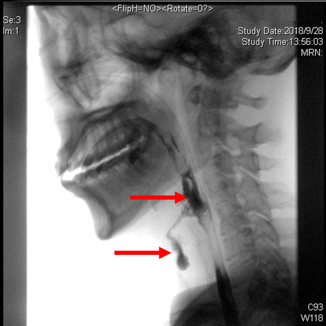 (1)电视荧光吞咽造影检查(Videofluroscopic Swallowing Study, VFSS):如图所示可看出,食管上有液体堆积,难以下咽(环咽肌开放不足);存在明显的误吸(液体流到声门下);动态视频观察到会厌折返欠佳。