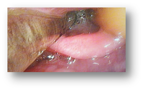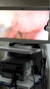 (2)电视内镜吞咽功能检查(Video Endoscopic Swallowing Study, VESS): 如图所示,检查结果显示唾液过分泌;右侧声带闭合不全。