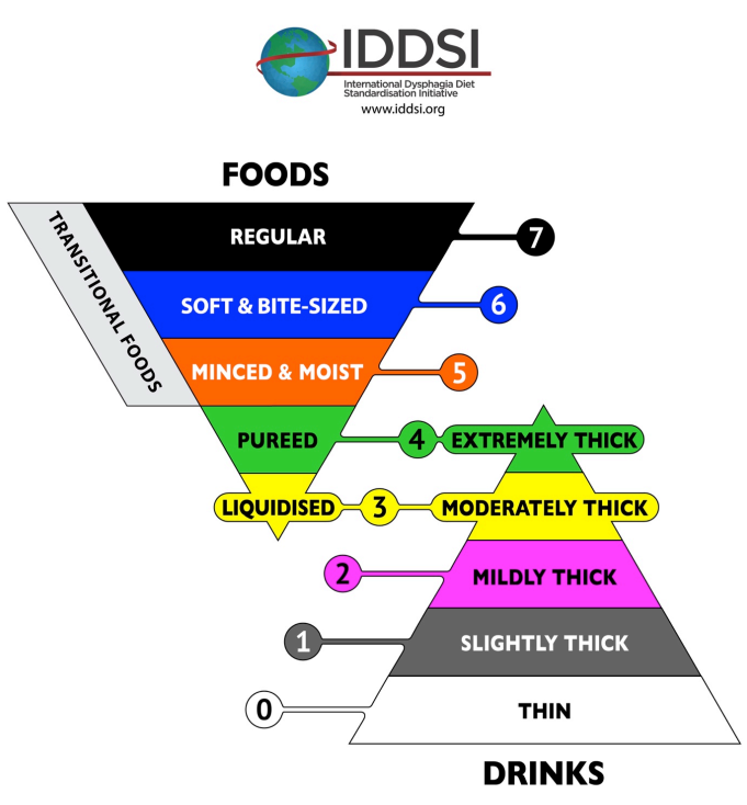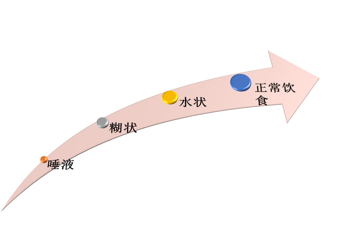 根据国际吞咽障碍标准化饮食发起组织提出的0-7共8个分级,根据这个标准,我们根据由易到难的食物性状给该钱女士制定了阶梯式目标。如图所示,在尚不能经口进食的情况下,请营养科会诊,制定鼻饲营养输入配比,确保患者在此期间营养均衡。