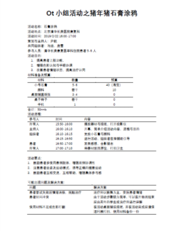 看似简单的一次石膏彩绘活动的背后一点儿也不简单,作业治疗师需要考虑每位患者的病情特点、治疗需求、情绪状态等,对活动内容、形式、分工、环境、工具等进行全面计划。经过OT治疗小组三位作业治疗师讨论与分析后,尹航OT治疗师制定了一份详尽的治疗计划,内容包括活动时间地点,活动主题,活动目的,材料准备与预算,活动流程等。此外,还准备了PPT控制活动进程,并有相应的应急预案防止意外发生。