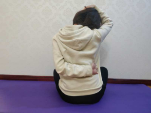 方法:取坐位,将一只手抓住椅子或者如图背在背后固定好,脸转向对侧约45°,用手将头部往前下方压,保持15-20秒。