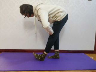 单腿迈一小步向前,双手扶于该侧膝盖之上以保持腿部伸直,尽可能的翘起脚尖同时弯腰,保持15-20秒。