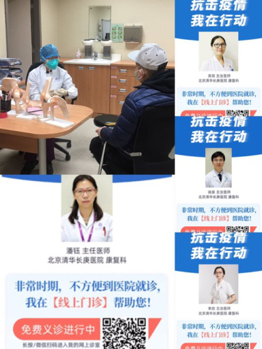 随着2020年的疫情日益严峻,越来越多的患者只能居家隔离无法到医院就医,盼望康复的急切心情和对未知的新冠肺炎的恐惧,让很多患者焦灼难安。为了缓解病人的恐惧和康复需求,本着不耽误每一个患者康复的信念,北京清华长庚医院康复医学科潘钰主任紧急召开一次特殊的线上科会,动员康复医学科全科同仁,多渠道开展线上义诊和康复指导,为的是正确引导患者正确认识疫情,更是让患者能够得到科学的康复指导和治疗。潘钰主任带领吴琼、李欣和徐泉三位主治医师每天开展线上义诊和指导,这大大解决了患者不能到医院到医院就医的问,焦急就医的心情也得到了舒缓;同时联合央视网,潘钰主任和樊森朝治疗师在线直播脑卒中居家康复指导,线上观看人数万人次,潘钰主任渊博的专业知识和樊森朝治疗师精湛的日常化康复训练指导,让更多的居家脑卒中患者认识到居家康复也很有帮助。