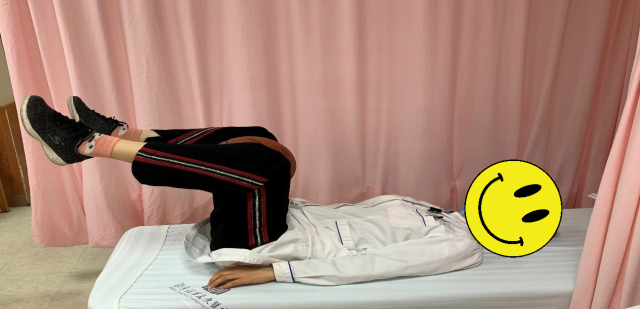 仰卧位,屈髋屈膝状态双腿夹紧球,训练过程中骨盆保持稳定,吸气准备,呼气腹部紧绷