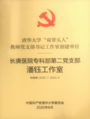 2020年7月1日,清华大学纪念中国共产党成立99周年大会上,专科部第二党支部书记潘钰工作室入选清华大学“双带头人”教师党支部书记工作室,成为全校第二批八个“双带头人”教师党支部书记工作室。7月23日在北京清华长庚医院党支部书记例会上,党委书记周月红“双带头人”教师党支部书记工作室给予建设指导,要按照清华大学党委的建设要求,创新党支部建设方案,探索在大学背景下建设医疗基层党支部的工作方法。7月29日北京清华长庚医院专科部第二党支部正式启动工作室工作,会议由党支部书记潘钰主任主持,专科部党员、积极分子及部分群众参会。会议重点讨论了工作室的工作方案,让党支部党员和群众广泛知晓党支部建设目标、建设计划和建设措施,促进未来两年工作室创建工作。