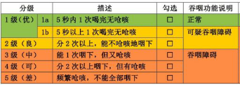 吞咽障碍的筛查是通过辨认口咽吞咽障碍的临床体征,发现存在吞咽障碍风险患者的简单评价方法。通常,吞咽障碍的筛查可在床旁进行,包括:①吞咽困难的相关主诉;②吞咽器官的感觉、运动、反射、结构的体格检查;③试验性吞咽:令患者吞咽不同量及黏度的食物,通常包括水、稠糊状、固体这三种黏度的食物,观察吞咽过程。目前,饮水试验是最多应用的较为有效的方法。洼田饮水实验:让患者一次性喝下30ml水,观察和记录饮水时间、有无呛咳、饮水状况等。具体分级如下表: