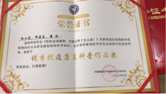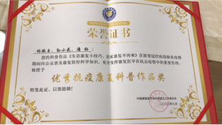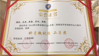 中国康复医学会科学普及工作委员会第二届康复科普创新作品大赛拉开帷幕,科室积极组织参加,因组织工作表现突出获“最佳组织奖”,科普性与专业性兼备的《PRP再生修复膝关节》获得“科普微视频 二等奖”。此外,在新型冠状病毒肺炎疫情期间,积极组织参与医学会康复防控科普工作,被授予“优秀防疫康复科普作品奖。