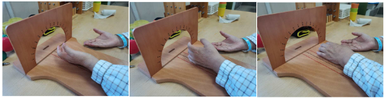 1、通过在平板上垂直固定一块有刻度的半圆木板,初始可让患者在不同的起始点,治疗师可让患者闭上眼睛,使患者可以最大化的集中注意力。①治疗师可将患者的前臂被动地摆放在不同的起始点,并随机等差的选取几个刻度数字,数字间的差值可由大至小地选取,相对于患者来说为由简及难。②选取刻度后治疗师依次将患者前臂的角度摆放在之前选取的刻度上,并通多语言告知患者使其尽最大可能地记住所有刻度所在位置。③之后治疗师将患者的前臂随机摆在之前选择的刻度上,并询问患者刻度数值,若患者回答正确则更换其他刻度数值并继续询问,若没有答对,治疗师不能直接否定患者的回答,可将患者前臂角度摆至患者所说的角度,告诉患者此位置为其所说数值的准确位置,之后再移回前一个所问刻度再次询问患者数值,若患者两次都未答对则告知其刻度数值,并重新将患者的前臂随机摆在之前选择的刻度上,询问患者刻度数值,直到患者能答对所有位置的刻度数值。