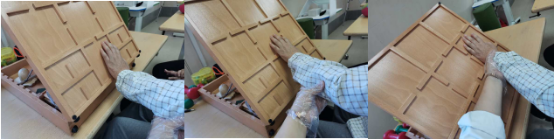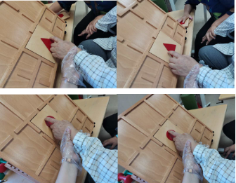 3、患者在经过一段时间训练之后,治疗师可在九格宫内增加不同形状的道具,如:三角型道具或者圆形道具等。除了放置在不同的格子内以外,我们还可以问患者,三角型起始点是在哪一个角,圆形道具是逆时针运动还是顺时针运动等。通过此方法我们可以训练患者上肢远端和近端的触觉、位置觉等感觉,使患者可以通过感觉的改变来接收外界的信息,从而改变运动的变化。