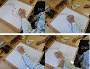 4、最后,经过之前的训练后,患者可以相对自如的前臂旋前旋后,也能完成肩关节的运动,我们可以通过在平面上画不同的线,让患者顺着线运动。首先我们可以让治疗师带着闭着双眼的患者被动在线上移动,在画完一条线之后询问患者之前的运动轨迹为平板多条不规则线条中的哪一条,如果患者回答正确,治疗师可再换一条线,如果回答错,治疗师需重新带领患者画一遍,如果多次都回答错误,可让患者睁眼画一遍线,之后再次询问。直到患者可以较轻松的回答对所有线条的区别。