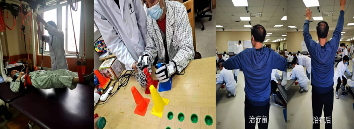 这里病种多样,诊疗技术先进。除了常规的OT、PT、ST、理疗等治疗,还开展了脑机接口技术、康复机器人、超声引导下肉毒素、PRP注射治疗等先进的诊疗技术。在这六个月时间里,我管理的患者包括脑血管病所致偏瘫、言语障碍、吞咽障碍,脊髓术后所致截瘫、尿便障碍,肿瘤后淋巴水肿、偏瘫肩痛、外伤致前后交叉韧带损伤术后的患者等。同时参与了门诊患者的诊治工作。其中一些特殊病例让我印象深刻。脑梗死合并帕金森病的患者通过制定详细的综合性治疗方案,患者在短短1个月的时间就由卧床状态康复到独立步行,手功明显恢复,日常生活大部分自理。肩痛的患者,在当地治疗了8个月的时间未缓解,来诊时疼痛明显,严重影响睡眠,肩关节不能抬举活动。经过潘钰主任的精准诊治,1周后患者疼痛完全缓解,肩关节活动自如。外伤致脊髓圆锥损伤导致排尿障碍的患者经过治疗1周后拔除尿管,恢复自主排尿。脊髓术后导致深感觉障碍的患者,通过运动认知训练,恢复独立步行能力。还有来自全国各地的淋巴水肿患者,经过消肿治疗都得到了良好的康复。几乎来诊的每一个患者,从发病数天甚至数年以上的都会得到不同程度的进步。这些治疗成果得益于精准的诊断、先进的治疗技术、团队的协作以及以病人为中心的责任心。