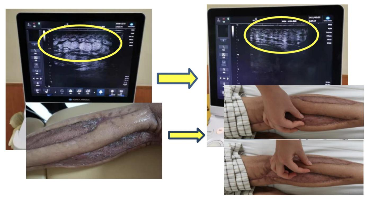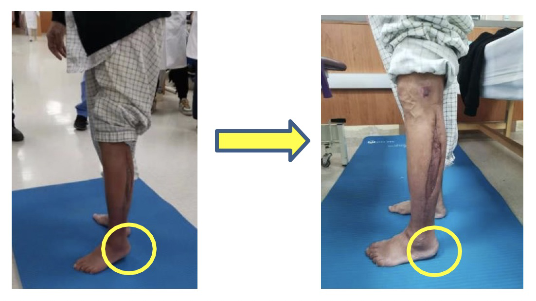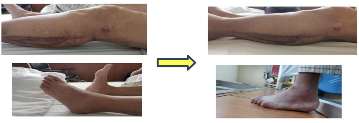 通过积极地康复治疗,姬大叔的功能得到了明显提高,左小腿肿胀消退了,双侧腿围基本一致;左小腿瘢痕皮肤明显软化,触摸不再硬邦邦的;左膝关节可完全伸直了;步行时左侧足跟可以着地,步态得到明显改善。姬大叔及其爱人对康复效果表示很满意,虽然左侧踝关节仍不能主动活动,但是借助支具走路不是大问题,很快就可以重返社会,继续工作了。