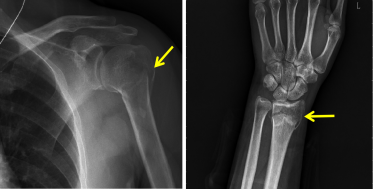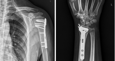 图2. 左侧肱骨近端、桡骨远端骨折内固定术后改变