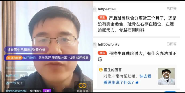活动最后,徐泉通过连麦的形式与网友“面对面”答疑,帮助网友解决存在的健康问题。如:产后耻骨联合分离及腹直肌分离方面的咨询;运动造成膝关节损伤的相关答疑;腰椎膨出、肋关节炎、颞下颌关节炎等导致疼痛的相关问题的讲解,并针对不同病种的治疗方法提出了相应的建议,对网友们的提问留言进行了解答。本次义诊活动共连麦7次,回答提问留言26个。