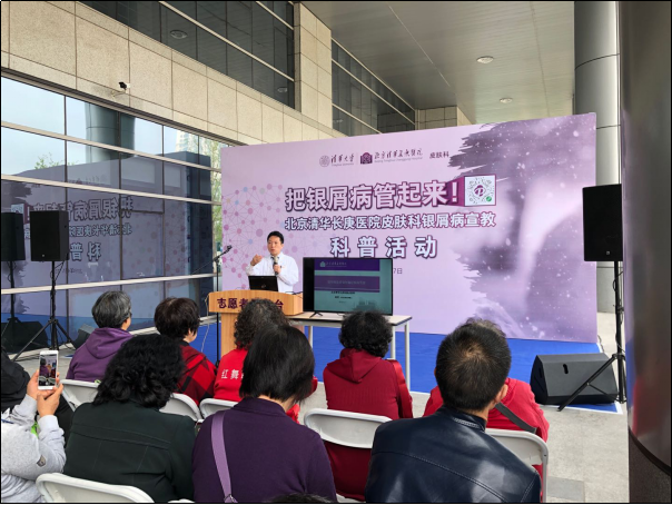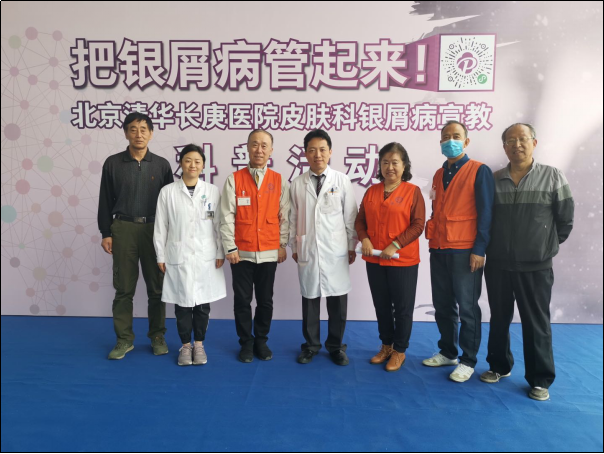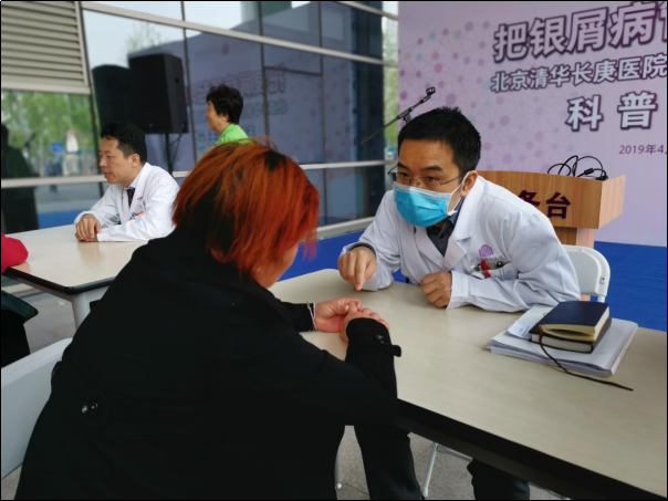 银屑病是对患者身心具有重大影响的炎症性疾病。我国患病人数可达650万。银屑病患者关节炎、心脑血管疾病发病风险明显升高,可以给患者带来严重的健康后果。因此正确的防控银屑病十分重要。2019年 4月17日清华大学附属北京清华长庚医院皮肤科团队于上午9时30分在医院门诊入口西侧举办了“把银屑病管起来”的健康宣教及义诊活动,约200位患者与居民现场参与活动。皮肤科医师团队带领大家正确认识银屑病及和其伴随的各种健康风险,帮助病友有效进行疾病的自我管理,传播银屑病慢病管理的概念。