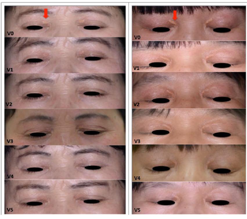(箭头为点阵CO2治疗,治疗前V0及5次治疗后V5,皮损基本消退)