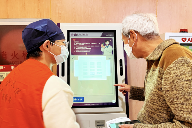 丁子涵同学向老人讲解自助机的建档操作流程(岗位:一层内科区域自助机)